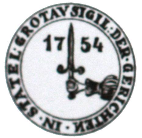 (D) Soudní pečeť – průměr 30 mm (červený vosk). Opis: GERICHTS [ SIGIL IN GROTAV („Soudní pečeť v Hrádku“). V pečetním poli, jehož vnější okraj je bohatě zdoben různými motivy, vyniká z pravého horního rohu obrněná, v lokti ohnutá ruka, držící vztyčený meč, z jehož hrušky visí miskové váhy. Čepel meče provází na každé straně lilie a pod loktem je třetí. Jestliže ruka s mečem a váhami symbolizují „trestající rameno spravedlnosti“, pak lilie jsou jednoznačně odvozeny od pečeti města.
