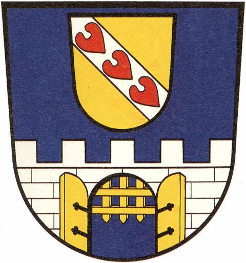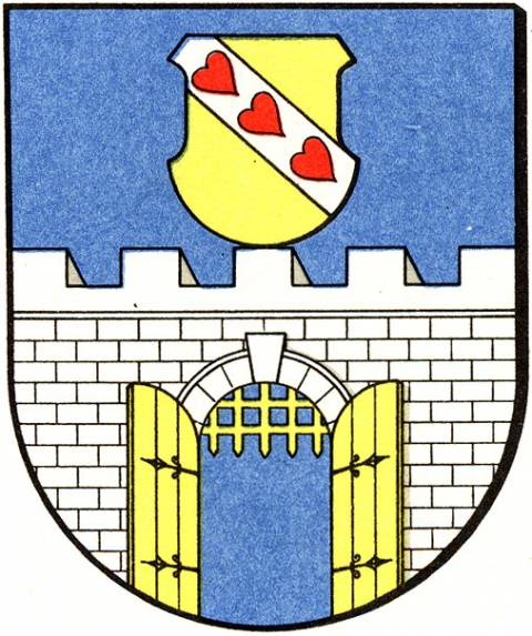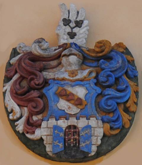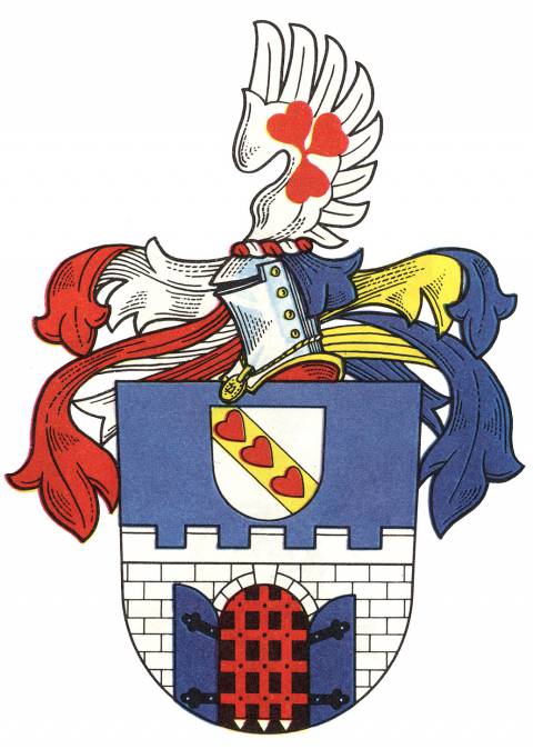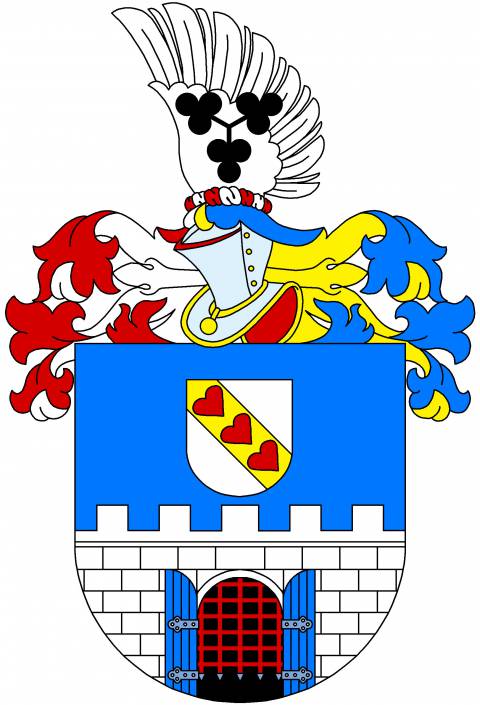 V modrém štítě stříbrná kvádrovaná hradba prolomená černou bránou s polospuštěnou červenou mříží se železnými hroty a otevřenými modrými vraty se železnými závěsy se stříbrnými hřeby. Nad hradbou stříbrný štítek s kosmým zlatým břevnem se třemi kosmo položenými červenými srdci. Na štítě kolčí helm s červeno-stříbrnou točenicí a přikrývadly vpravo červeno-stříbrnými a vlevo modro-zlatými, klenotem stříbrné křídlo s černým jetelovým trojlistem (2, 1)“.