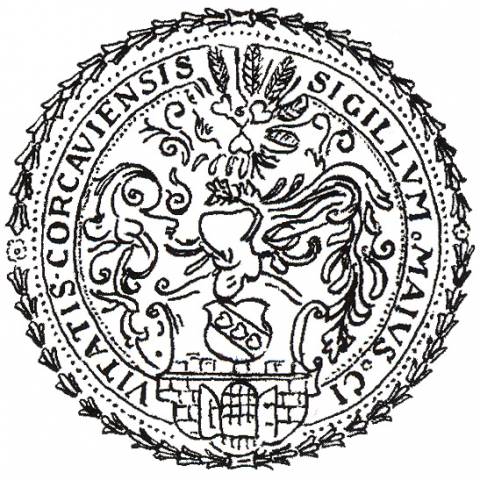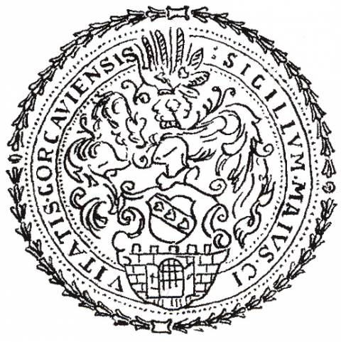 První z nich, jejíž otisk známe z roku 1655, má průměr 45 mm, ohraničený vavřínovým věncem rostoucím z válečků nahoře a dole k růžičkám na bocích pečeti. Latinský opis kapitálami mezi vnějším perlovcem a lištou a vnitřní lištou a perlovcem, je přerušen nahoře klenotem a dole patou štítu (zač. na 1. hod, konec na 11 hod.). SIGILLVM Ÿ MAIVS Ÿ CI /štít/ VITATIS Ÿ GORCAVIENSIS /klenot/. V pečetním poli je štít s vykrojenými boky, nahoře a v bocích pod vykrojením rolverky, pata štítu je tvořena třemi oblouky. Ve štítě kvádrovaná hradba, s pěti stínkami cimbuří, stojící pravděpodobně na trávníku, který je naznačen svislým šrafováním. V hradbě je brána s otevřenými vraty na závěsech a se spuštěnou mříží. Nad hradbou štítek s kosmým břevnem, v němž jsou tři kosmá srdíčka za sebou. Na štítě turnajská přilba s točenicí, přikrývadly a klenotem křídla, v němž je trojlist zakončený srdíčky (2, 1; Katalog pečetí, pečetidel a sbírkových odlitků, č. záznamu 21650, SOkA Louny, AM Louny, inv. č. 4123, dále jen Katalog pečetí; Liška, Karel, Sbírka komunálních znaků, pečetí a razítek, III/2. Znaky, pečeti a razítka českých měst a městeček J – M. Brno 2013, s. 37, kresba pečeti č. 1, dále jen Liška, Sbírka).