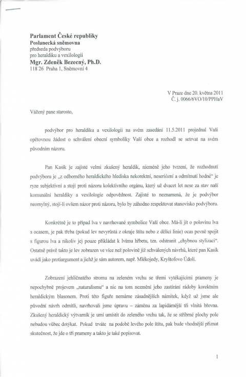 „…podvýbor…na svém zasedání 11. 5. 2011 projednal Vaší žádost o schválení obecní symboliky Vaší obce a rozhodl se setrvat na svém původním názoru.