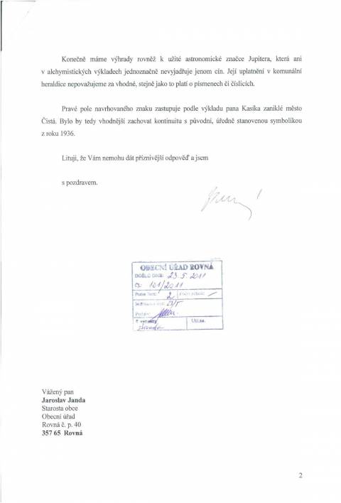 „…Pokusím se o vyjádření ke zdůvodnění podvýboru k již druhému odmítnutí návrhu znaku obce Rovná... A to přesto, že jsem v minulé reakci po prvním neschválení uvedl heraldicky seriózní, korektní a oborově dostačující rozklad k oběma „předmětům“ odmítnutí – tedy, jak k figuře lva, tak i k tzv. „pramenům…“
