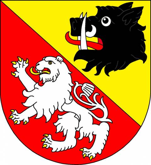 1. Zlato-červeně kosmo dělený štít. Nahoře černá kančí hlava se stříbrným okem a zbrojí a s červeným jazykem, dole stříbrný kráčející lev se zlatou zbrojí.